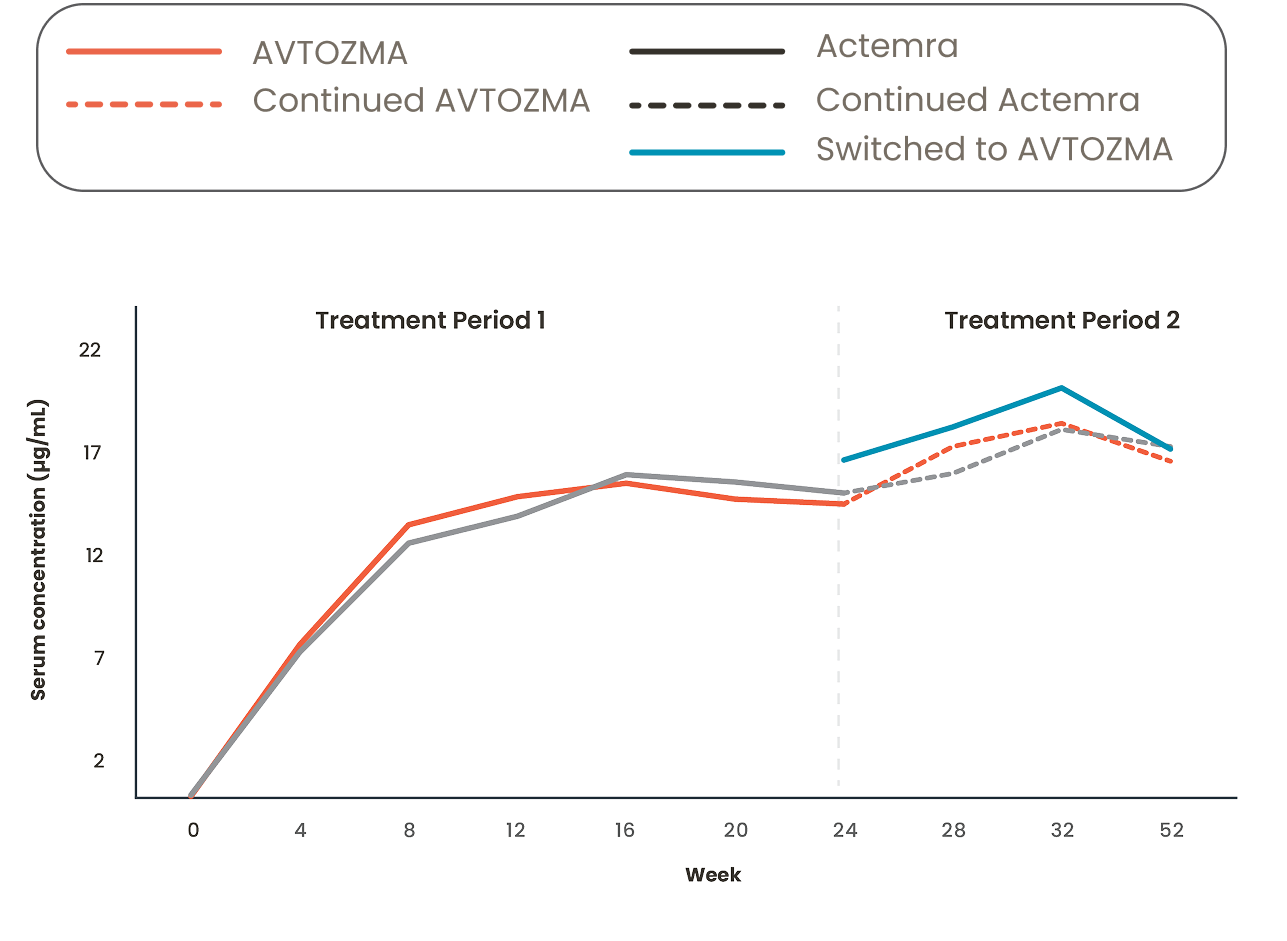• Treatment period 2 (week 24 to week 52): Patients receiving Actemra were re-randomized 1:1 to continue Actemra or switch to AVTOZMA; patients initially receiving AVTOZMA continued receiving AVTOZMA1